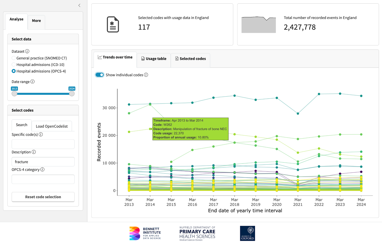 The online app is accessed at https://bennettoxford.github.io/opencodecounts/. You can also download the R package for bespoke analysis and visualisations by typing remotes::install_github("bennettoxford/opencodecounts")