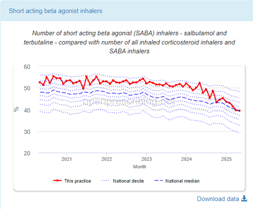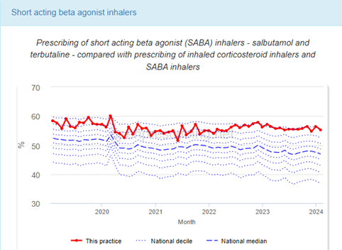 At our 2024 partners’ away day I highlighted that we were outliers in SABA prescribing with a level of prescribing significantly over and above what could be expected, considering our practice population. Our excellent asthma and COPD QOF achievement belied what the prescribing data highlighted.